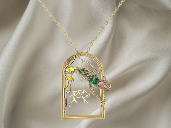 Inspired by Henri Matisse, this necklace takes you on an enchanting artistic journey. At its heart, golden dancers sway gracefully, inspired by the dance of life in Matisse’s timeless painting The Joy of Life. Their forms, once painted, are now sculpted in gold, hanging lightly within the frame as if the spirit of art moves freely in the air.