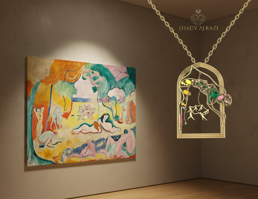 Each stone is more than a color — it is a crystallized emotion in timeless art, transforming Matisse’s dance into a golden symphony worn around the neck. This is not just a necklace; it is a celebration of life, whispering freedom.
