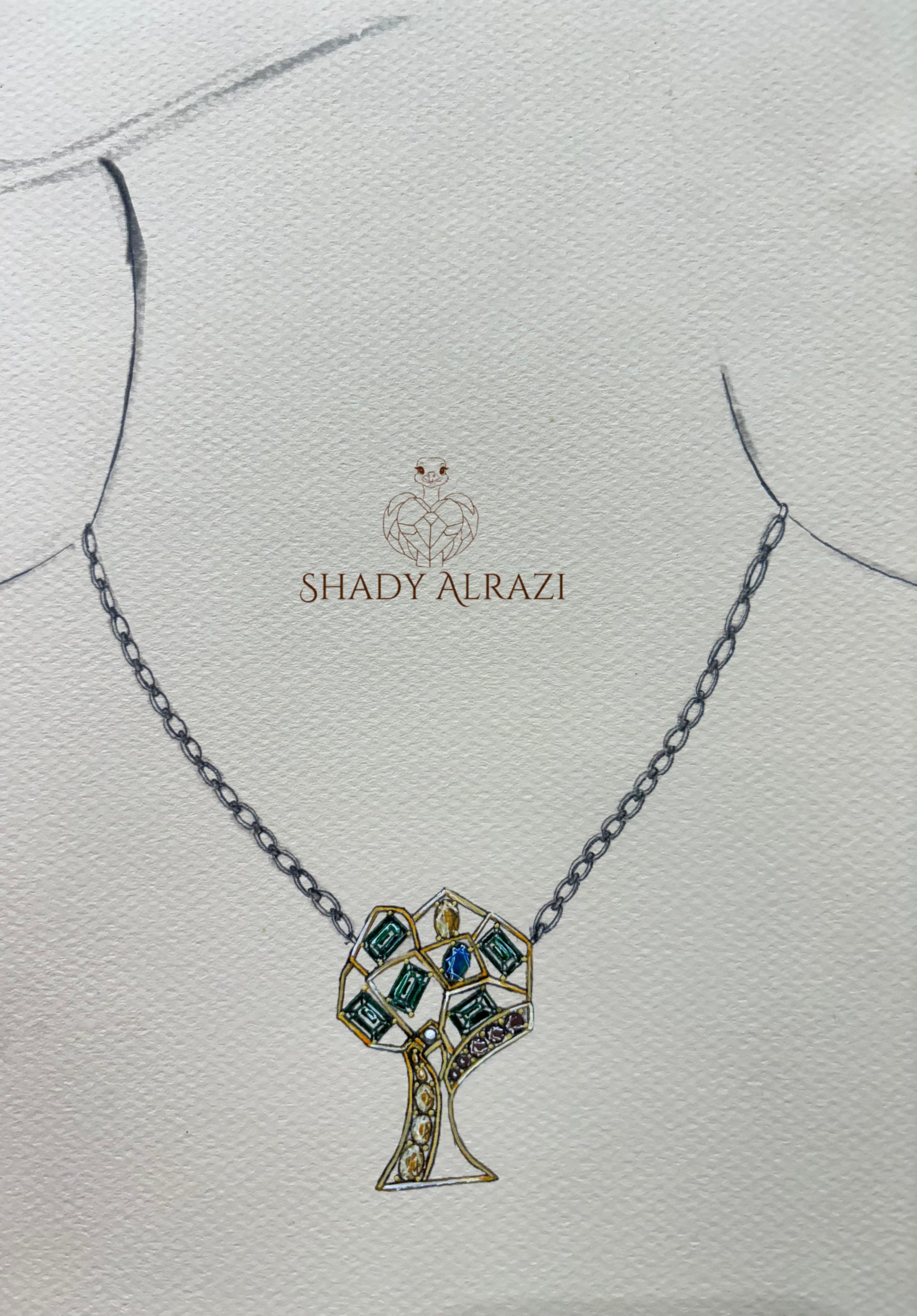 السلسلة مستوحاة من نزول موسى من جبل سيناء. الخطوط المكسّرة تعبّر عن صراع الوصايا مع الانحراف البشري، والذهب الممتد يرمز للنور الإلهي الثابت. الألوان والأحجار تحمل رموزًا عميقة: الأزرق للسماء والروحانية، الأخضر للشجرة والحياة، والبني للجذور والقوة. حجر السترين يرمز لموسى، والجزء الذي شبهناه بالألماس يمثل الوصية الإلهية كنور يُضيء الحقيقة. الشكل الهرمي يعكس الجبل، والقطعة كلها تجسد موسى — الوصايا — الجبل — الغضب — النور الإلهي، كرمز للقوة، القيادة، والخير.