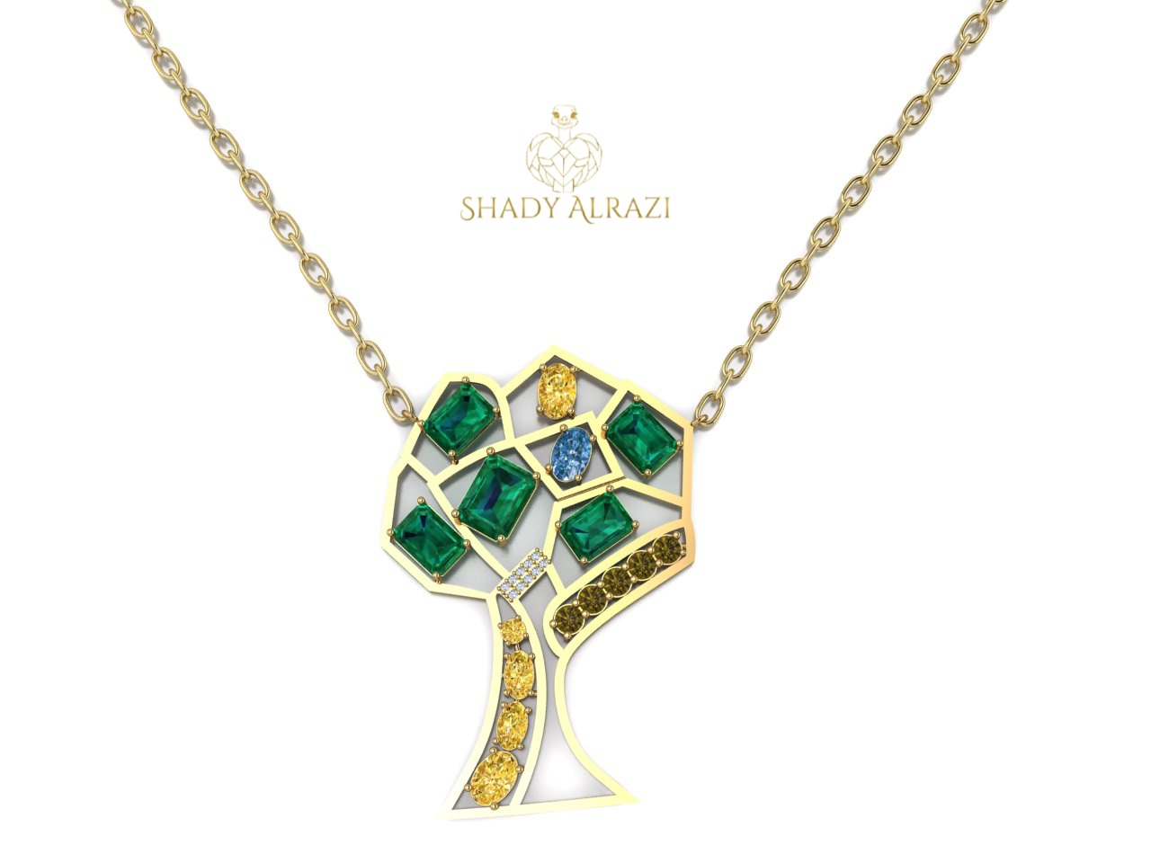 The necklace is inspired by Moses’ descent from Mount Sinai. The broken lines represent the struggle of the commandments with human deviation, and the extended gold symbolizes the unbreakable divine light. The colors and stones carry deep symbolism: blue for the sky and spirituality, green for the tree and life, brown for the roots and strength. Citrine represents Moses, and the part we likened to diamonds symbolizes the divine law as a light that illuminates the truth. The pyramidal shape reflects the mountain, and the piece embodies Moses, the commandments, the mountain, anger, and divine light—a symbol of power, leadership, and goodness.
